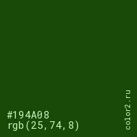 Цвет #194A08 в цветовой модели RGB обозначается тремя октетами (25, 74, 8) в десятичном формате и #194A08 в шестнадцатиричном (hex) формате, которые являются интенсивностью красного 25 (hex 19), интенсивность зелёного 74 (hex 4A) и интенсивность синего 8 (hex 08).