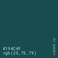 Цвет #194C4F в цветовой модели RGB обозначается тремя октетами (25, 76, 79) в десятичном формате и #194C4F в шестнадцатиричном (hex) формате, которые являются интенсивностью красного 25 (hex 19), интенсивность зелёного 76 (hex 4C) и интенсивность синего 79 (hex 4F).