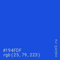 Цвет #194FDF в цветовой модели RGB обозначается тремя октетами (25, 79, 223) в десятичном формате и #194FDF в шестнадцатиричном (hex) формате, которые являются интенсивностью красного 25 (hex 19), интенсивность зелёного 79 (hex 4F) и интенсивность синего 223 (hex DF).