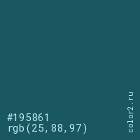Цвет #195861 в цветовой модели RGB обозначается тремя октетами (25, 88, 97) в десятичном формате и #195861 в шестнадцатиричном (hex) формате, которые являются интенсивностью красного 25 (hex 19), интенсивность зелёного 88 (hex 58) и интенсивность синего 97 (hex 61).