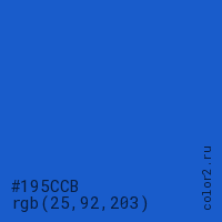 Цвет #195CCB в цветовой модели RGB обозначается тремя октетами (25, 92, 203) в десятичном формате и #195CCB в шестнадцатиричном (hex) формате, которые являются интенсивностью красного 25 (hex 19), интенсивность зелёного 92 (hex 5C) и интенсивность синего 203 (hex CB).
