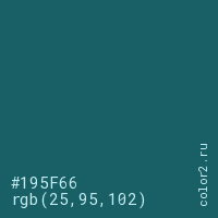 Цвет #195F66 в цветовой модели RGB обозначается тремя октетами (25, 95, 102) в десятичном формате и #195F66 в шестнадцатиричном (hex) формате, которые являются интенсивностью красного 25 (hex 19), интенсивность зелёного 95 (hex 5F) и интенсивность синего 102 (hex 66).