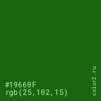 Цвет #19660F в цветовой модели RGB обозначается тремя октетами (25, 102, 15) в десятичном формате и #19660F в шестнадцатиричном (hex) формате, которые являются интенсивностью красного 25 (hex 19), интенсивность зелёного 102 (hex 66) и интенсивность синего 15 (hex 0F).