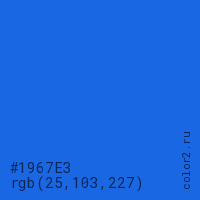 Цвет #1967E3 в цветовой модели RGB обозначается тремя октетами (25, 103, 227) в десятичном формате и #1967E3 в шестнадцатиричном (hex) формате, которые являются интенсивностью красного 25 (hex 19), интенсивность зелёного 103 (hex 67) и интенсивность синего 227 (hex E3).