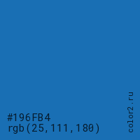 Цвет #196FB4 в цветовой модели RGB обозначается тремя октетами (25, 111, 180) в десятичном формате и #196FB4 в шестнадцатиричном (hex) формате, которые являются интенсивностью красного 25 (hex 19), интенсивность зелёного 111 (hex 6F) и интенсивность синего 180 (hex B4).