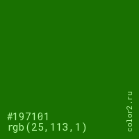 Цвет #197101 в цветовой модели RGB обозначается тремя октетами (25, 113, 1) в десятичном формате и #197101 в шестнадцатиричном (hex) формате, которые являются интенсивностью красного 25 (hex 19), интенсивность зелёного 113 (hex 71) и интенсивность синего 1 (hex 01).