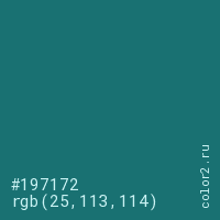 Цвет #197172 в цветовой модели RGB обозначается тремя октетами (25, 113, 114) в десятичном формате и #197172 в шестнадцатиричном (hex) формате, которые являются интенсивностью красного 25 (hex 19), интенсивность зелёного 113 (hex 71) и интенсивность синего 114 (hex 72).