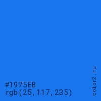 Цвет #1975EB в цветовой модели RGB обозначается тремя октетами (25, 117, 235) в десятичном формате и #1975EB в шестнадцатиричном (hex) формате, которые являются интенсивностью красного 25 (hex 19), интенсивность зелёного 117 (hex 75) и интенсивность синего 235 (hex EB).