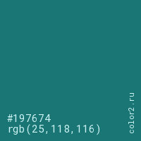 Цвет #197674 в цветовой модели RGB обозначается тремя октетами (25, 118, 116) в десятичном формате и #197674 в шестнадцатиричном (hex) формате, которые являются интенсивностью красного 25 (hex 19), интенсивность зелёного 118 (hex 76) и интенсивность синего 116 (hex 74).
