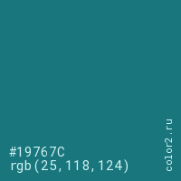 Цвет #19767C в цветовой модели RGB обозначается тремя октетами (25, 118, 124) в десятичном формате и #19767C в шестнадцатиричном (hex) формате, которые являются интенсивностью красного 25 (hex 19), интенсивность зелёного 118 (hex 76) и интенсивность синего 124 (hex 7C).