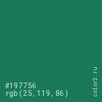 Цвет #197756 в цветовой модели RGB обозначается тремя октетами (25, 119, 86) в десятичном формате и #197756 в шестнадцатиричном (hex) формате, которые являются интенсивностью красного 25 (hex 19), интенсивность зелёного 119 (hex 77) и интенсивность синего 86 (hex 56).