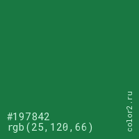 Цвет #197842 в цветовой модели RGB обозначается тремя октетами (25, 120, 66) в десятичном формате и #197842 в шестнадцатиричном (hex) формате, которые являются интенсивностью красного 25 (hex 19), интенсивность зелёного 120 (hex 78) и интенсивность синего 66 (hex 42).
