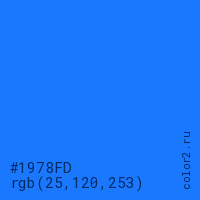 Цвет #1978FD в цветовой модели RGB обозначается тремя октетами (25, 120, 253) в десятичном формате и #1978FD в шестнадцатиричном (hex) формате, которые являются интенсивностью красного 25 (hex 19), интенсивность зелёного 120 (hex 78) и интенсивность синего 253 (hex FD).