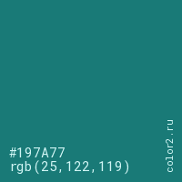 Цвет #197A77 в цветовой модели RGB обозначается тремя октетами (25, 122, 119) в десятичном формате и #197A77 в шестнадцатиричном (hex) формате, которые являются интенсивностью красного 25 (hex 19), интенсивность зелёного 122 (hex 7A) и интенсивность синего 119 (hex 77).