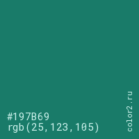 Цвет #197B69 в цветовой модели RGB обозначается тремя октетами (25, 123, 105) в десятичном формате и #197B69 в шестнадцатиричном (hex) формате, которые являются интенсивностью красного 25 (hex 19), интенсивность зелёного 123 (hex 7B) и интенсивность синего 105 (hex 69).