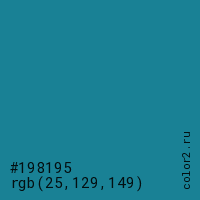 Цвет #198195 в цветовой модели RGB обозначается тремя октетами (25, 129, 149) в десятичном формате и #198195 в шестнадцатиричном (hex) формате, которые являются интенсивностью красного 25 (hex 19), интенсивность зелёного 129 (hex 81) и интенсивность синего 149 (hex 95).