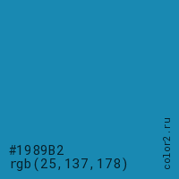 Цвет #1989B2 в цветовой модели RGB обозначается тремя октетами (25, 137, 178) в десятичном формате и #1989B2 в шестнадцатиричном (hex) формате, которые являются интенсивностью красного 25 (hex 19), интенсивность зелёного 137 (hex 89) и интенсивность синего 178 (hex B2).