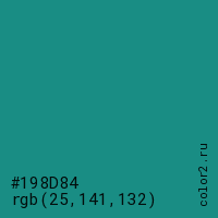 Цвет #198D84 в цветовой модели RGB обозначается тремя октетами (25, 141, 132) в десятичном формате и #198D84 в шестнадцатиричном (hex) формате, которые являются интенсивностью красного 25 (hex 19), интенсивность зелёного 141 (hex 8D) и интенсивность синего 132 (hex 84).