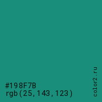 Цвет #198F7B в цветовой модели RGB обозначается тремя октетами (25, 143, 123) в десятичном формате и #198F7B в шестнадцатиричном (hex) формате, которые являются интенсивностью красного 25 (hex 19), интенсивность зелёного 143 (hex 8F) и интенсивность синего 123 (hex 7B).
