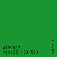 Цвет #199632 в цветовой модели RGB обозначается тремя октетами (25, 150, 50) в десятичном формате и #199632 в шестнадцатиричном (hex) формате, которые являются интенсивностью красного 25 (hex 19), интенсивность зелёного 150 (hex 96) и интенсивность синего 50 (hex 32).