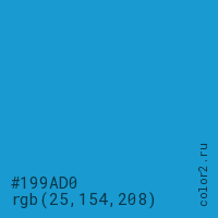 Цвет #199AD0 в цветовой модели RGB обозначается тремя октетами (25, 154, 208) в десятичном формате и #199AD0 в шестнадцатиричном (hex) формате, которые являются интенсивностью красного 25 (hex 19), интенсивность зелёного 154 (hex 9A) и интенсивность синего 208 (hex D0).