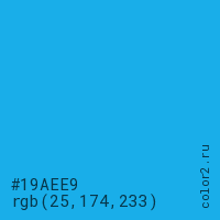 Цвет #19AEE9 в цветовой модели RGB обозначается тремя октетами (25, 174, 233) в десятичном формате и #19AEE9 в шестнадцатиричном (hex) формате, которые являются интенсивностью красного 25 (hex 19), интенсивность зелёного 174 (hex AE) и интенсивность синего 233 (hex E9).