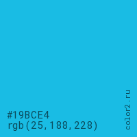 Цвет #19BCE4 в цветовой модели RGB обозначается тремя октетами (25, 188, 228) в десятичном формате и #19BCE4 в шестнадцатиричном (hex) формате, которые являются интенсивностью красного 25 (hex 19), интенсивность зелёного 188 (hex BC) и интенсивность синего 228 (hex E4).