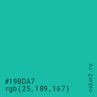 Цвет #19BDA7 в цветовой модели RGB обозначается тремя октетами (25, 189, 167) в десятичном формате и #19BDA7 в шестнадцатиричном (hex) формате, которые являются интенсивностью красного 25 (hex 19), интенсивность зелёного 189 (hex BD) и интенсивность синего 167 (hex A7).