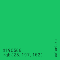 Цвет #19C566 в цветовой модели RGB обозначается тремя октетами (25, 197, 102) в десятичном формате и #19C566 в шестнадцатиричном (hex) формате, которые являются интенсивностью красного 25 (hex 19), интенсивность зелёного 197 (hex C5) и интенсивность синего 102 (hex 66).