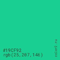 Цвет #19CF92 в цветовой модели RGB обозначается тремя октетами (25, 207, 146) в десятичном формате и #19CF92 в шестнадцатиричном (hex) формате, которые являются интенсивностью красного 25 (hex 19), интенсивность зелёного 207 (hex CF) и интенсивность синего 146 (hex 92).