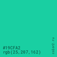 Цвет #19CFA2 в цветовой модели RGB обозначается тремя октетами (25, 207, 162) в десятичном формате и #19CFA2 в шестнадцатиричном (hex) формате, которые являются интенсивностью красного 25 (hex 19), интенсивность зелёного 207 (hex CF) и интенсивность синего 162 (hex A2).