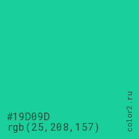 Цвет #19D09D в цветовой модели RGB обозначается тремя октетами (25, 208, 157) в десятичном формате и #19D09D в шестнадцатиричном (hex) формате, которые являются интенсивностью красного 25 (hex 19), интенсивность зелёного 208 (hex D0) и интенсивность синего 157 (hex 9D).
