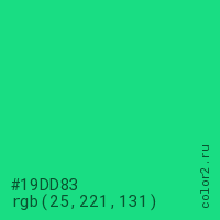 Цвет #19DD83 в цветовой модели RGB обозначается тремя октетами (25, 221, 131) в десятичном формате и #19DD83 в шестнадцатиричном (hex) формате, которые являются интенсивностью красного 25 (hex 19), интенсивность зелёного 221 (hex DD) и интенсивность синего 131 (hex 83).