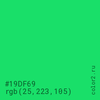 Цвет #19DF69 в цветовой модели RGB обозначается тремя октетами (25, 223, 105) в десятичном формате и #19DF69 в шестнадцатиричном (hex) формате, которые являются интенсивностью красного 25 (hex 19), интенсивность зелёного 223 (hex DF) и интенсивность синего 105 (hex 69).