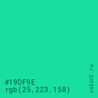 Цвет #19DF9E в цветовой модели RGB обозначается тремя октетами (25, 223, 158) в десятичном формате и #19DF9E в шестнадцатиричном (hex) формате, которые являются интенсивностью красного 25 (hex 19), интенсивность зелёного 223 (hex DF) и интенсивность синего 158 (hex 9E).