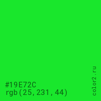 Цвет #19E72C в цветовой модели RGB обозначается тремя октетами (25, 231, 44) в десятичном формате и #19E72C в шестнадцатиричном (hex) формате, которые являются интенсивностью красного 25 (hex 19), интенсивность зелёного 231 (hex E7) и интенсивность синего 44 (hex 2C).