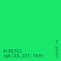 Цвет #19E76C в цветовой модели RGB обозначается тремя октетами (25, 231, 108) в десятичном формате и #19E76C в шестнадцатиричном (hex) формате, которые являются интенсивностью красного 25 (hex 19), интенсивность зелёного 231 (hex E7) и интенсивность синего 108 (hex 6C).