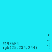 Цвет #19EAF4 в цветовой модели RGB обозначается тремя октетами (25, 234, 244) в десятичном формате и #19EAF4 в шестнадцатиричном (hex) формате, которые являются интенсивностью красного 25 (hex 19), интенсивность зелёного 234 (hex EA) и интенсивность синего 244 (hex F4).