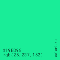 Цвет #19ED98 в цветовой модели RGB обозначается тремя октетами (25, 237, 152) в десятичном формате и #19ED98 в шестнадцатиричном (hex) формате, которые являются интенсивностью красного 25 (hex 19), интенсивность зелёного 237 (hex ED) и интенсивность синего 152 (hex 98).