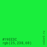 Цвет #19EE3C в цветовой модели RGB обозначается тремя октетами (25, 238, 60) в десятичном формате и #19EE3C в шестнадцатиричном (hex) формате, которые являются интенсивностью красного 25 (hex 19), интенсивность зелёного 238 (hex EE) и интенсивность синего 60 (hex 3C).