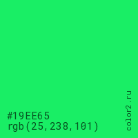 Цвет #19EE65 в цветовой модели RGB обозначается тремя октетами (25, 238, 101) в десятичном формате и #19EE65 в шестнадцатиричном (hex) формате, которые являются интенсивностью красного 25 (hex 19), интенсивность зелёного 238 (hex EE) и интенсивность синего 101 (hex 65).