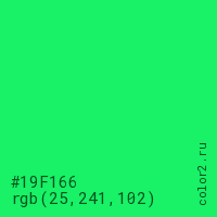 Цвет #19F166 в цветовой модели RGB обозначается тремя октетами (25, 241, 102) в десятичном формате и #19F166 в шестнадцатиричном (hex) формате, которые являются интенсивностью красного 25 (hex 19), интенсивность зелёного 241 (hex F1) и интенсивность синего 102 (hex 66).