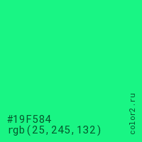 Цвет #19F584 в цветовой модели RGB обозначается тремя октетами (25, 245, 132) в десятичном формате и #19F584 в шестнадцатиричном (hex) формате, которые являются интенсивностью красного 25 (hex 19), интенсивность зелёного 245 (hex F5) и интенсивность синего 132 (hex 84).