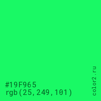 Цвет #19F965 в цветовой модели RGB обозначается тремя октетами (25, 249, 101) в десятичном формате и #19F965 в шестнадцатиричном (hex) формате, которые являются интенсивностью красного 25 (hex 19), интенсивность зелёного 249 (hex F9) и интенсивность синего 101 (hex 65).