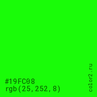 Цвет #19FC08 в цветовой модели RGB обозначается тремя октетами (25, 252, 8) в десятичном формате и #19FC08 в шестнадцатиричном (hex) формате, которые являются интенсивностью красного 25 (hex 19), интенсивность зелёного 252 (hex FC) и интенсивность синего 8 (hex 08).