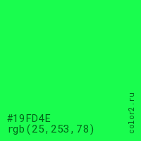 Цвет #19FD4E в цветовой модели RGB обозначается тремя октетами (25, 253, 78) в десятичном формате и #19FD4E в шестнадцатиричном (hex) формате, которые являются интенсивностью красного 25 (hex 19), интенсивность зелёного 253 (hex FD) и интенсивность синего 78 (hex 4E).