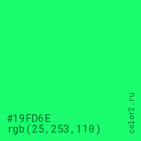 Цвет #19FD6E в цветовой модели RGB обозначается тремя октетами (25, 253, 110) в десятичном формате и #19FD6E в шестнадцатиричном (hex) формате, которые являются интенсивностью красного 25 (hex 19), интенсивность зелёного 253 (hex FD) и интенсивность синего 110 (hex 6E).