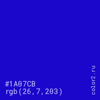 Цвет #1A07CB в цветовой модели RGB обозначается тремя октетами (26, 7, 203) в десятичном формате и #1A07CB в шестнадцатиричном (hex) формате, которые являются интенсивностью красного 26 (hex 1A), интенсивность зелёного 7 (hex 07) и интенсивность синего 203 (hex CB).