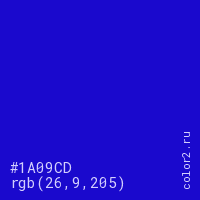 Цвет #1A09CD в цветовой модели RGB обозначается тремя октетами (26, 9, 205) в десятичном формате и #1A09CD в шестнадцатиричном (hex) формате, которые являются интенсивностью красного 26 (hex 1A), интенсивность зелёного 9 (hex 09) и интенсивность синего 205 (hex CD).