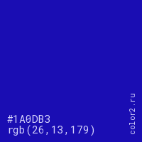 Цвет #1A0DB3 в цветовой модели RGB обозначается тремя октетами (26, 13, 179) в десятичном формате и #1A0DB3 в шестнадцатиричном (hex) формате, которые являются интенсивностью красного 26 (hex 1A), интенсивность зелёного 13 (hex 0D) и интенсивность синего 179 (hex B3).